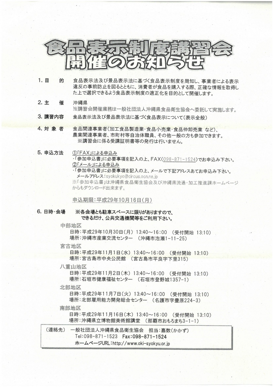 食品表示制度講習会が開催されますので、食品関連事業者はぜひご参加ください。