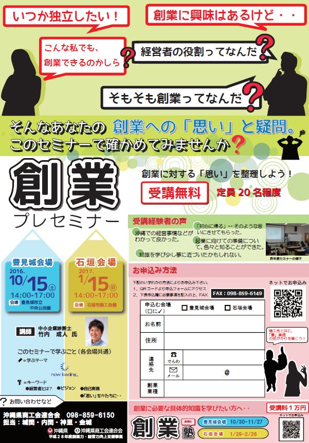 沖縄県商工会連合会では新規創業の促進、廃業防止、地域雇用機会の創出・確保を図り、地域経済の活性化と安定的発展に寄与することを目的として、下記の日程で「創業プレセミナー」を開催致します。